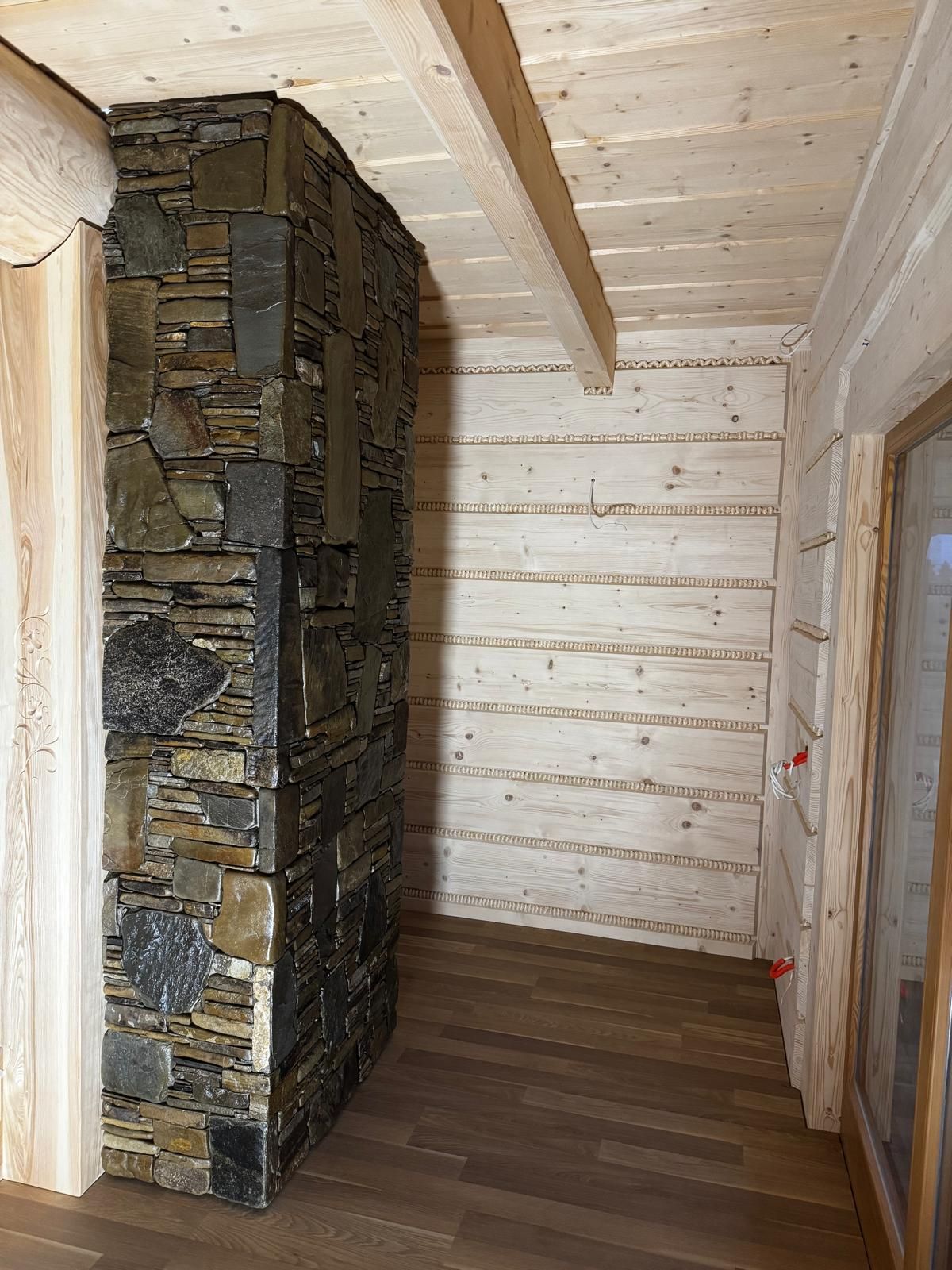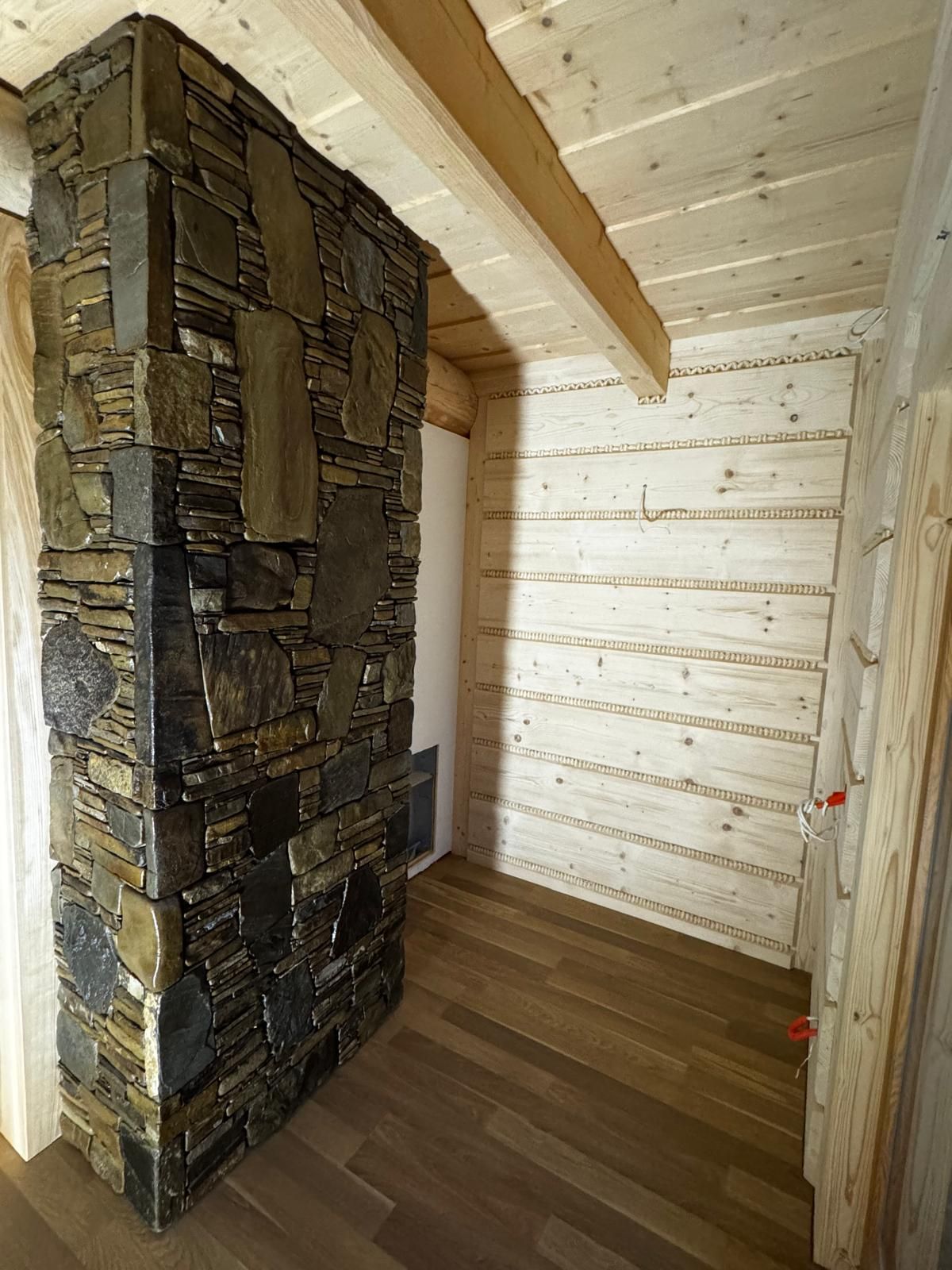 Interiørfinish med ulike materialer, inkludert stein, murstein, osv.